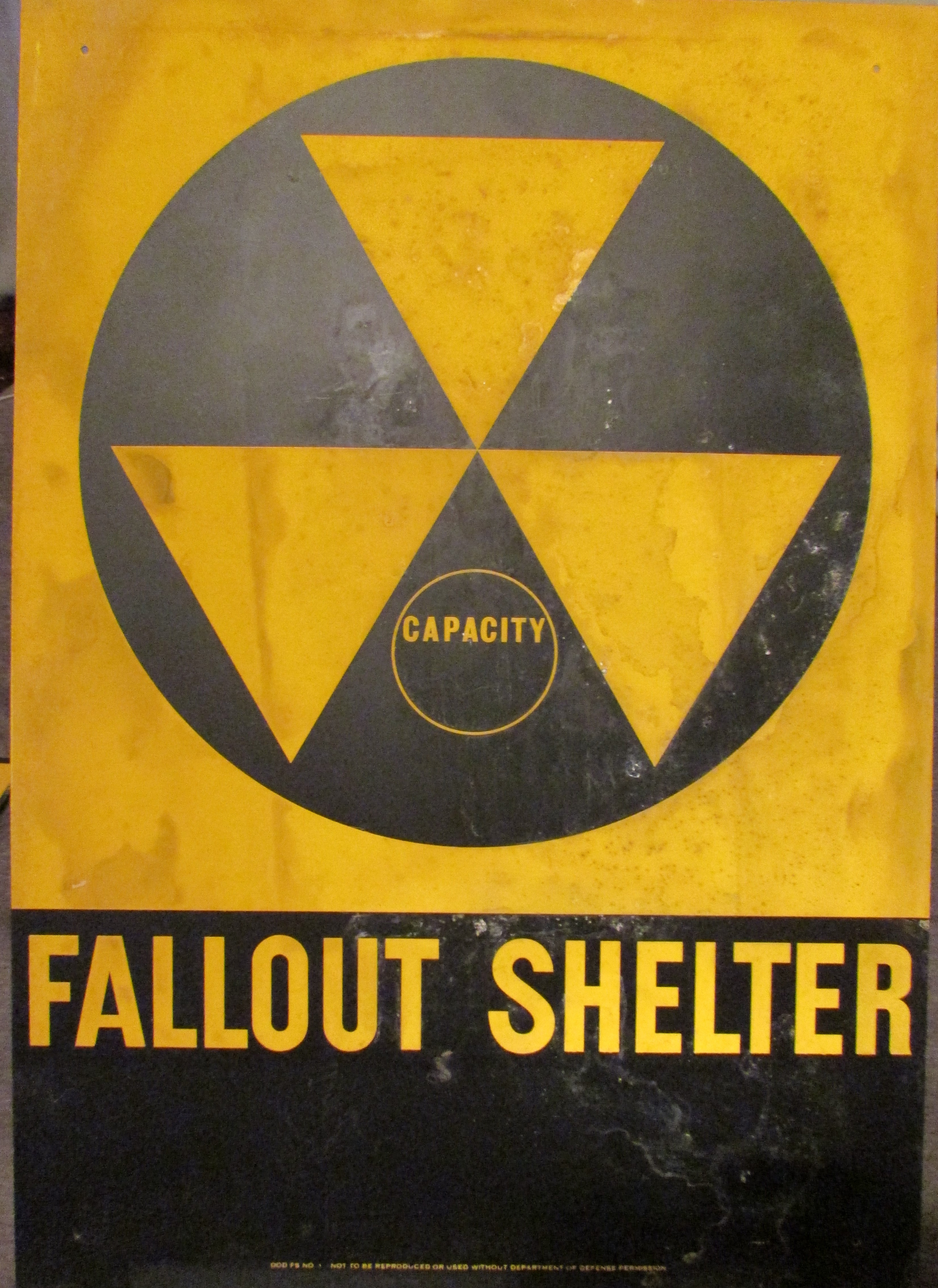 These were distributed in 1962 for the Shelter Marking Program. The two fallout shelter signs are the FS1 which is a 14 x 20 inch aluminum sign and the FS2 which is a 10 x 14 inch galvanized steel sign. Both have “Not To Be Reproduced Or Used Without Department Of Defense Permission.” at the bottom of the sign. The 14 x 20 were to be put on the outside of a building while the 10 x 14 were placed on the inside to direct people to the Fallout Shelter. The signs also came with stickers of numbers, capacity, arrows, and instructions that would be placed on the sign.