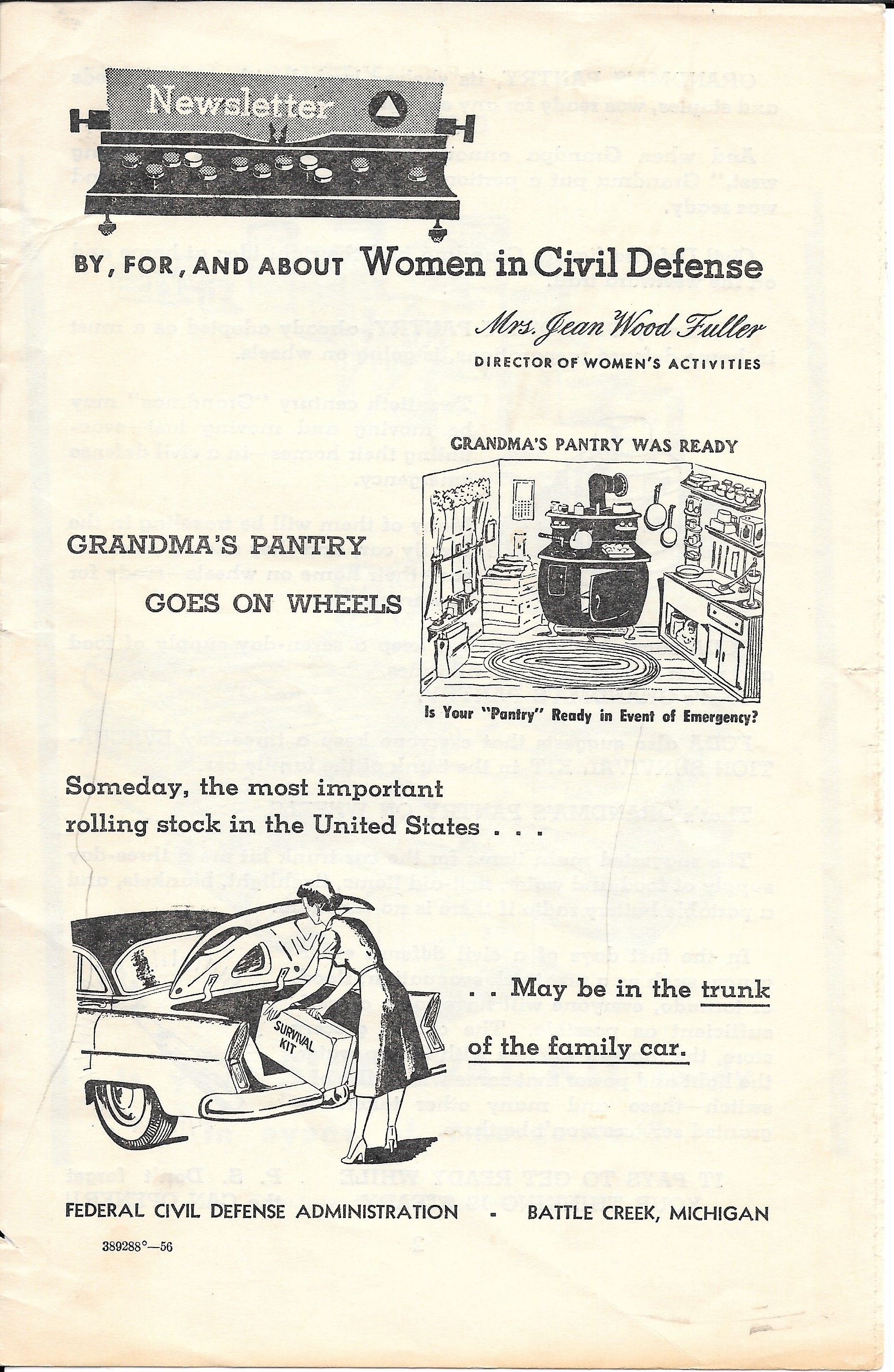 This pamphlet from the Federal Civil Defense Administration (FCDA) was published in 1956. It is from and geared towards Women in Civil Defense. It covers the necessities to pack into your car in case of an emergency evacuation.