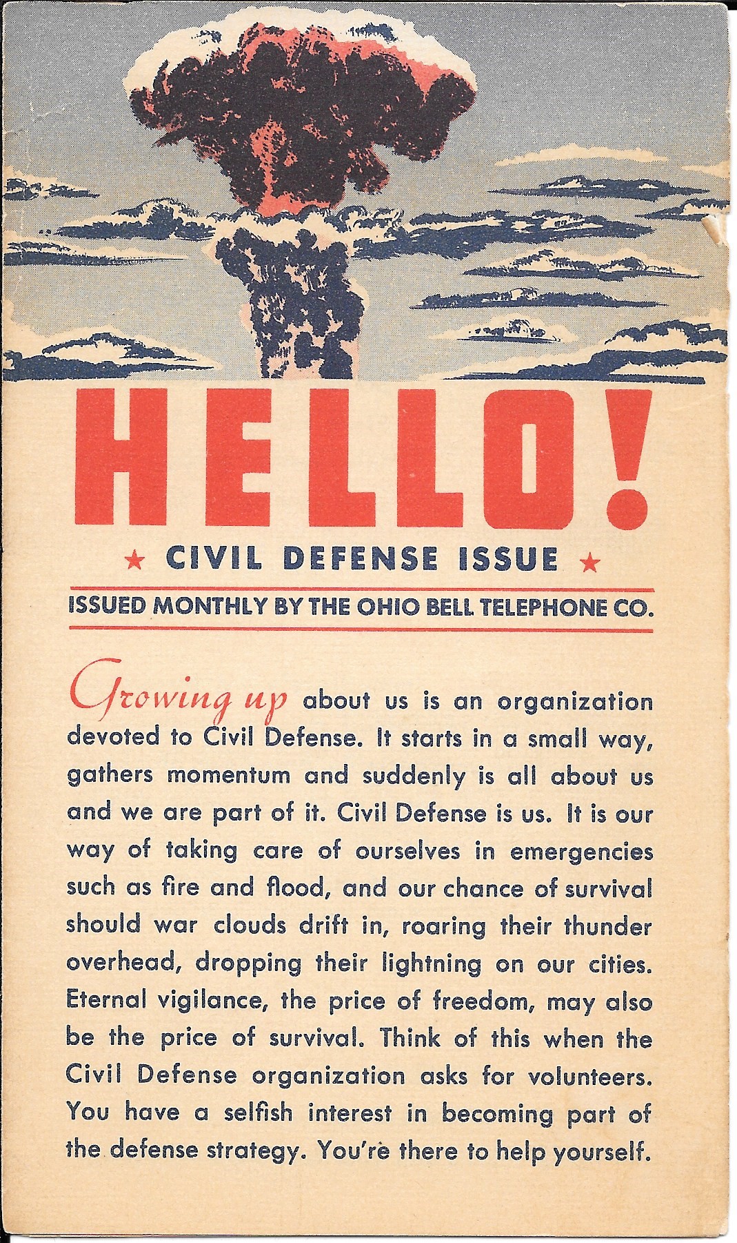 This is Civil Defense Issue of “Hello!” published by the Ohio Telephone Company. There is no date but the material discussed in the pamphlet put it into the early 1950’s.
